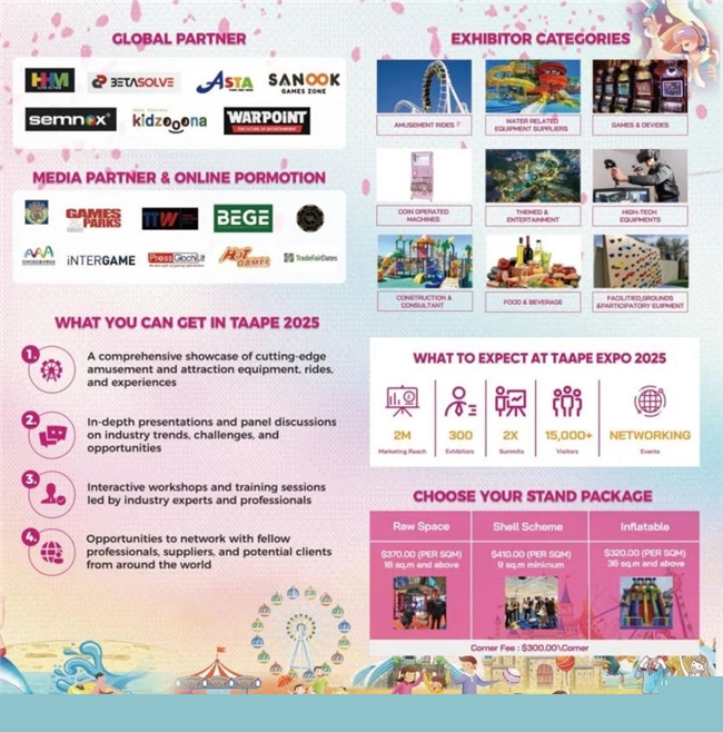 由中國動(dòng)漫集團(tuán)有限公司、泰國COMPASS集團(tuán)、廣東鴻威會(huì)展集團(tuán)聯(lián)合主辦的2025泰國文化用品、旅游裝備及景區(qū)游樂設(shè)施博覽會(huì)(TAAPE2025)是泰國知名游樂休閑類展會(huì)。該展會(huì)設(shè)立了水上裝備、游樂設(shè)施、戶外游樂、電子游樂設(shè)備等多個(gè)主題,展出內(nèi)容豐富多樣,包括IP授權(quán)與合作展區(qū)、衍生品設(shè)計(jì)與制造展區(qū)、手辦與模型展區(qū)等多個(gè)展區(qū)。此次展會(huì)恰逢中泰建交50周年重要?dú)v史時(shí)刻,依托泰國作為東盟樞紐的區(qū)位優(yōu)勢(shì),創(chuàng)新性地將傳統(tǒng)文化用品、旅游裝備與前沿元宇宙技術(shù)相結(jié)合,打造了全方位、多層次的文化貿(mào)易交流平臺(tái)。